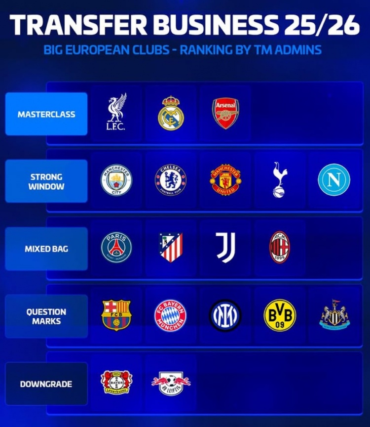 9月6日,欧洲主流联赛夏季转会窗口正式关闭。《转会市场》对多支欧洲俱乐部的夏窗操作进行了评级,结果如下: