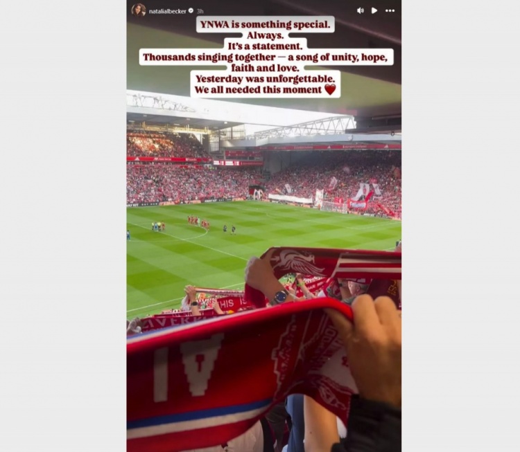 在她的帖子中,娜塔莉亚写道:“YNWA(你永远不会独行)是特别的。永远如此。这是一句宣言。成千上万的人一起唱这首歌,一首关于团结、希望、信念和爱的歌。昨天是难忘的一天,我们都需要这一刻。”